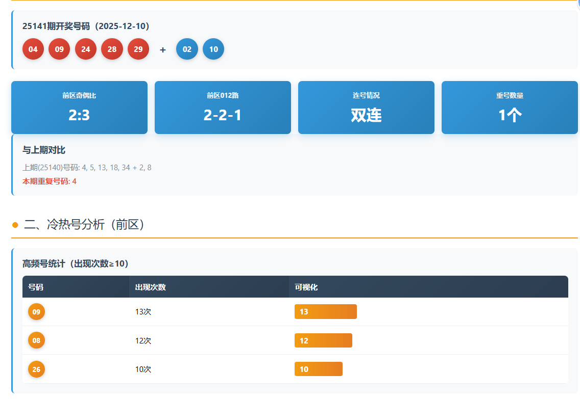 25141期开得有点意思,前区 04、09、24、28、29,后区 02、10。乍一看,这组号码就像“慢热型选手+突然炸场的小高潮”——前区一左一右都冒了头。奇偶比是 2:3,依旧是近段时间里相对常见的“偏偶风”;大小结构则呈现明显的“前小后大”,尤其后面的 28、29 像两座紧挨的山头,把四区五区的存在感拉满 😊。