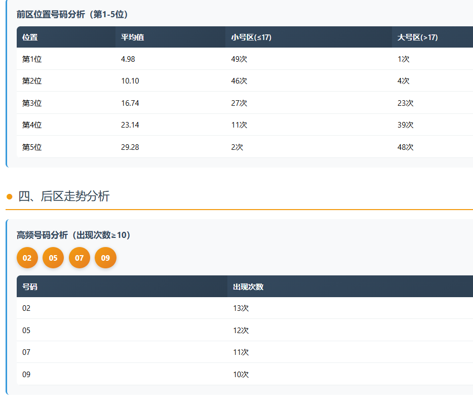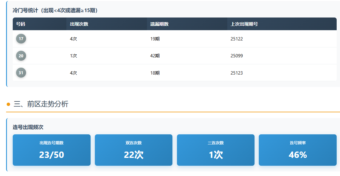 从 50 期的大样本看,前区的主要节奏是“奇偶平衡——适度连号——间隔性的重号”。连号将近一半期都有,双连更是主力军,这说明连号并不是偶然,而是一种稳定形态。这也让我们在观察当期结构时,可以适当关注位置连动。