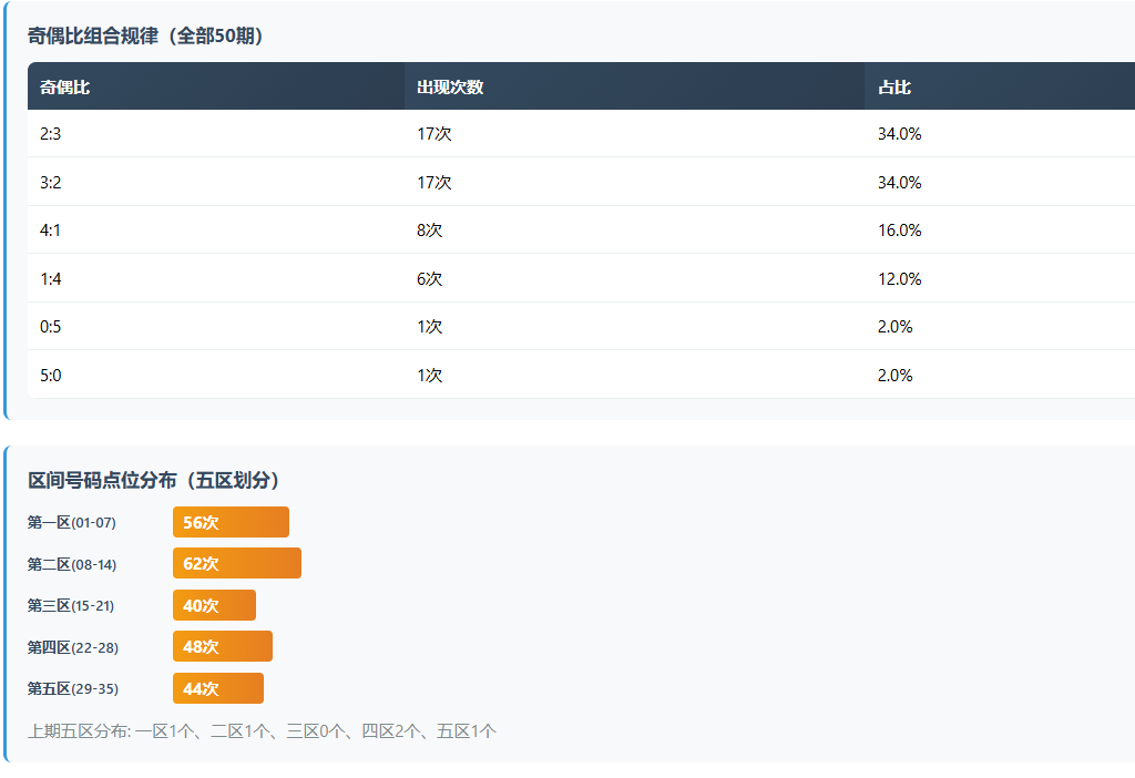 前区的奇偶比在 50 期里的分布非常均衡:2:3 和 3:2并列最多,各 17 次。这说明什么?说明目前的整体基调就是“均势走法”,不会偏向极端。如 4:1、1:4、5:0 这种极端组合虽偶尔亮相,但属于偶发事件。