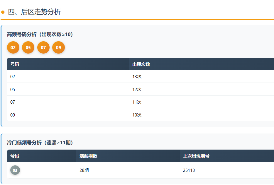 高频号的特点是稳定且分布较固定,比如 09、08 这对“中前区常客”,50期里基本没怎么断过存在感。