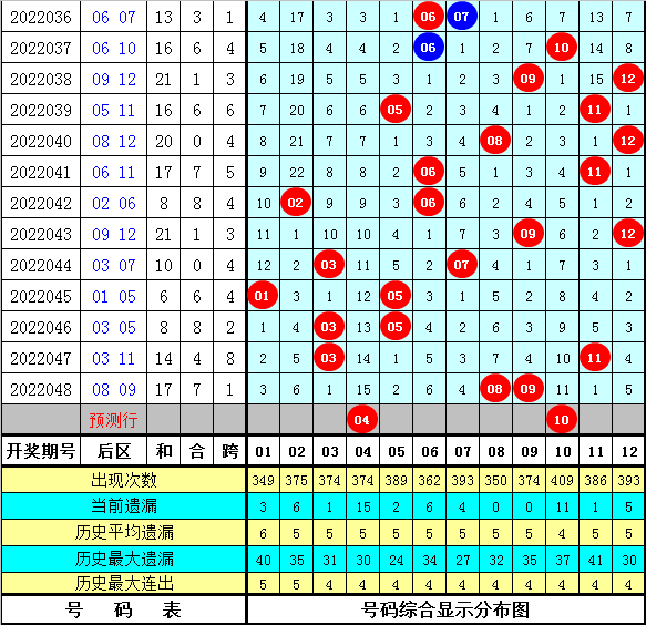 后区分析:上期后区奖号为08和09,最近10期后区各号码频次为:号码03、05、11出现3次,06、08、09、12出现2次,01、02、07出现1次,其中号码04、10没有出现,本期后区参考号码01、02、04、06、10、11,单注参考04+10。