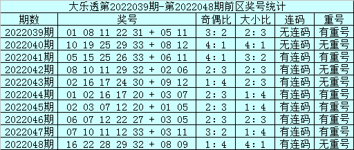 上期回顾:体彩大乐透第22048期奖号开出:16 22 28 29 32+08 09,前区奖号奇偶比为1:4,012路比为0:3:2,大小比为4:1,包含连码:28 29,没有开出重号。