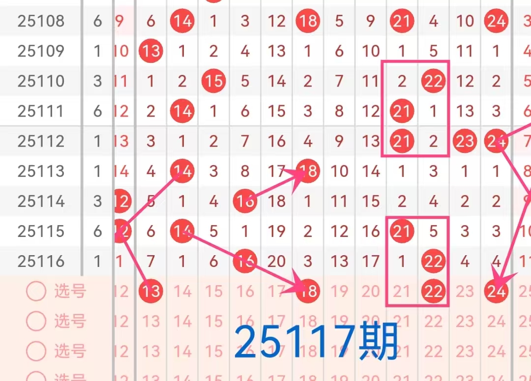 2. 二区(13-24):上期该区间开出两个号码16和22,号码16相隔3期后开出,号码23相隔5期后开出,且与前期开出的号码21形成斜连走势。根据历史开奖来看,近期该区间活跃度较低,本期预计会有1-2个号码会继续开出。特别是那些遗漏次数较大的号码和该区间内近期表现较好的号码,如13、18、22、24这几个号码在走势上表现出一定的稳定性,且与前几期出号形成呼应,有望出现在本期开奖中。