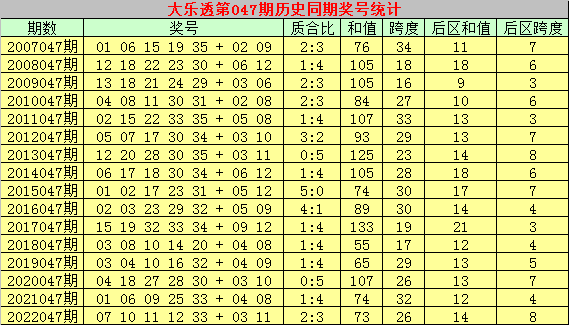 大乐透历史同期第2023047期奖号分析:
