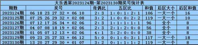 大乐透第2023130期奖号为:13、20、27、29、30+01、07,其中前区奖号奇偶比为3:2,和值为119,五区比为0:1:1:1:2,后区奖号和值为8,开出一大一小组合。