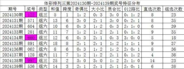 开奖公告:体彩排列三第2024139期开出奖号:536。组六,无重号,奇偶比2:1,大小比2:1,012比2:0:1,和值14,跨度3。