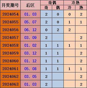 冷热比分析:上期后区冷热比0:2,近10期1:1开出3次,2:0开出1次,0:2开出5次,综合分析,本期预测后区冷热比0:2