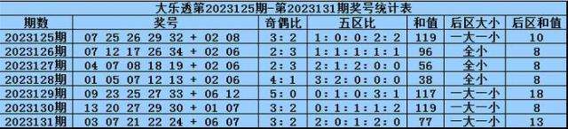 大乐透第2023131期奖号为:03、07、21、22、24+06、07,其中前区奖号奇偶比为3:2,和值为77,五区比为2:0:1:2:0,后区奖号和值为13,开出一大一小组合。