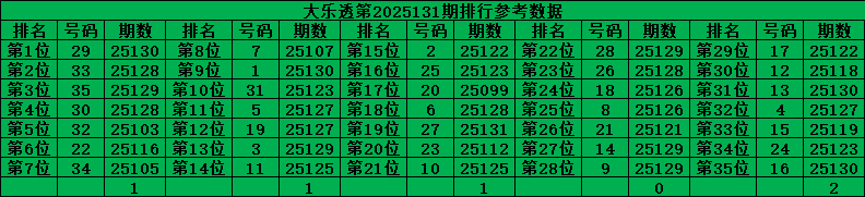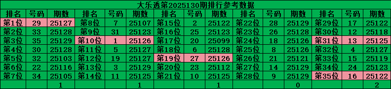 超级大乐透前区是从01-35的号码中每期开出5个号码,把历史数据按照出现次数排行后分成五个区,每个区7个号码,前二位的号码是热位号,中三位的号码是温位号,后二位的号码是冷位号,理论上每个区每期是开1个号码,对比最近开出的数据分析: