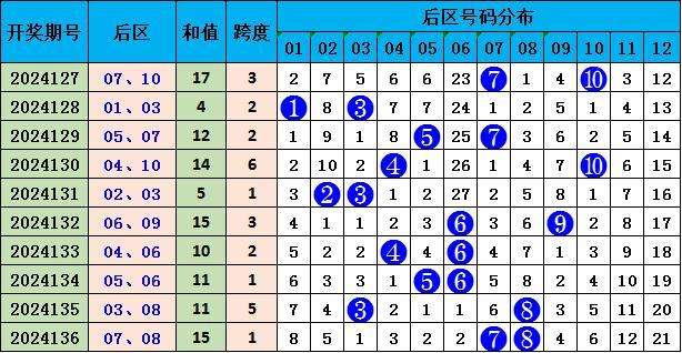 前区奇偶:上期前区奇偶比为3:2,最近10期前区奇偶比为24:26,本期注意前区奇码走热,本期预测奇偶比开出3:2。