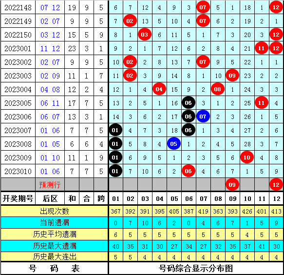 上期回顾:体彩大乐透第2023010期奖号为:05 06 13 23 26 + 01 06,前区奖号三区比为2:2:1,后区奖号奇偶比为1:1,大小比为0:2。