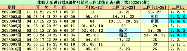 体彩大乐透第2023011期前区奖号三区分析(定义:第一区:01-12段,第二区:13-23段,第三区24-35段)