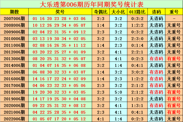 大乐透第2023006期开奖日期:2023年1月14日,历史上第006期已开出了16次奖号,历年同期号码分别为: