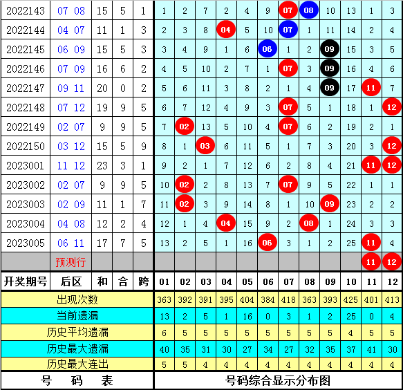 最近10期奖号中后区号码奇偶比为11:9,大小比为14:6,012路比为8:5:7;