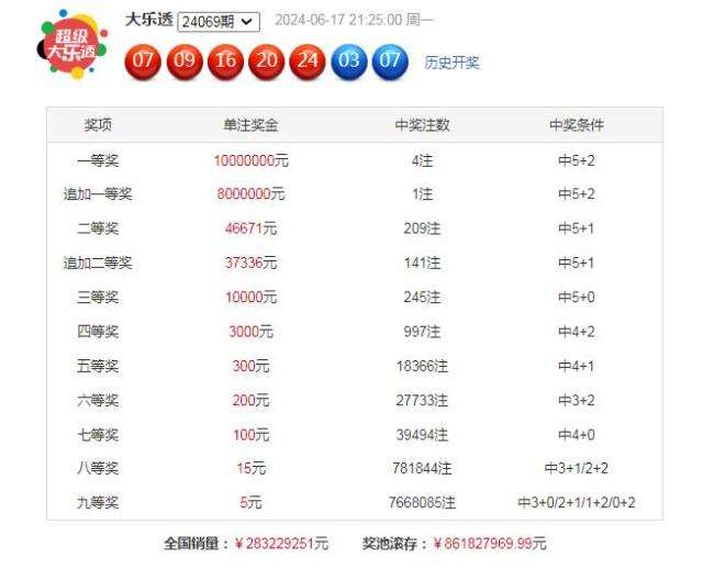 大乐透第24069期开奖。当期开奖号码为:前区07 09 16 20 24,后区03 07。当期前区号码大小比为2:3,奇偶比为2:3,三区比2:3:0;前区开出1枚重号20;后区开出小大组合03 07。