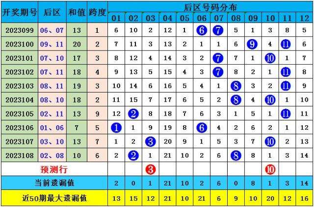 后区分析:大乐透后区上期开出偶偶组合,跨度为6。近10期后区奇偶组合出现3期,偶奇组合出现3期,奇奇组合出现2期,偶偶组合出现2期,本期预计奇偶组合回补;近10期后区两码跨度1-5开出7次,6-11开出3次,预计本期后区两码跨度为7,两码综合推荐:03、10。