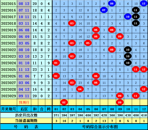 前第二区(13-23):上期没有出号,走冷断区,该区最近10期断区3次,共出现10个奖号,本期预计前第二区号码转温,看好出现1个号码。