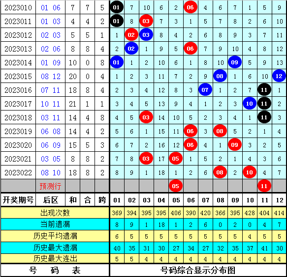 后区分析:最近7周星期六全小出现1期,一大一小出现5期,全大出现1期;全奇出现2期,全偶出现0期,一奇一偶出现5期,本期后区两码参考05和11。