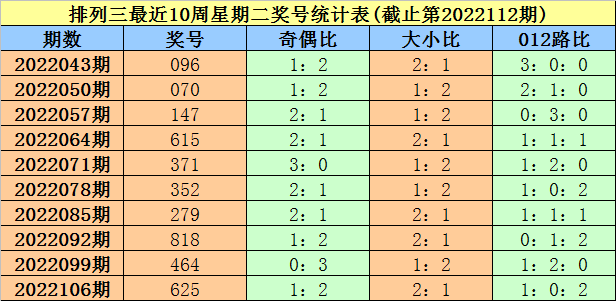 上期回顾:排列三第2022112期奖号为762。其中奖号奇偶比为1:2,大小比为2:1,012路比为1:1:1。