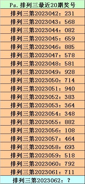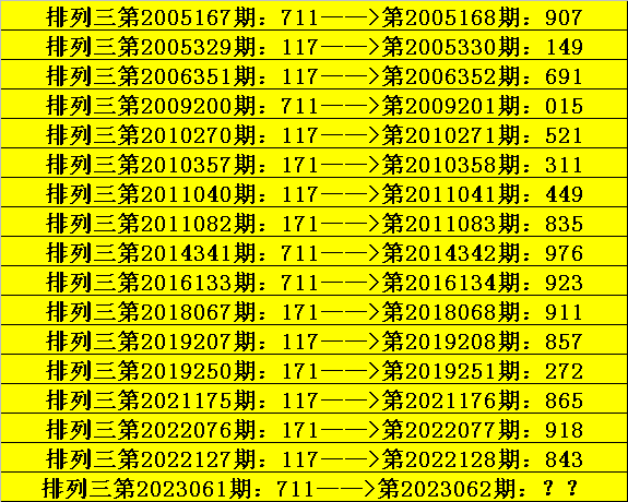 第2023061期排列三奖号为711,历史上该号码组选开出17次,下期奖号分别为:907、149、691、015、521、311、449、835、976、923、911、857、272、865、918、843。