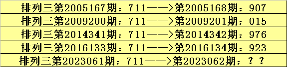 第2023061期排列三奖号为711,历史上该号码直选出现5次,下期奖号分别为:907、015、976、923。