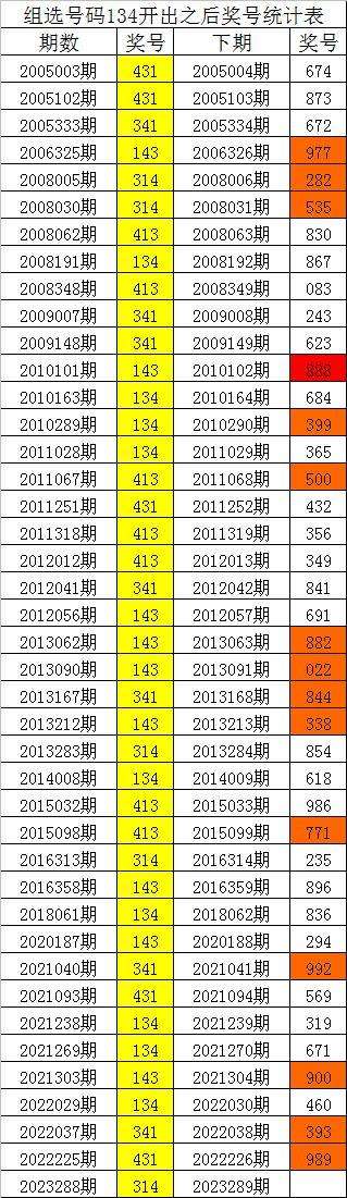 体彩排列三组选号码134历史上出现了42次,其下期奖号分别为:674、873、672、977、282、535、830、867、083、243、623、888、684、399、365、500、432、356、349、841、691、882、022、844、338、854、618、986、771、235、896、836、294、992、569、319、671、900、460、393、989,详细统计见下表: