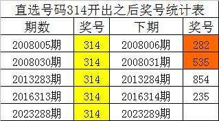 从上表统计可以看出,直选号码314开出之后,其下期奖号: