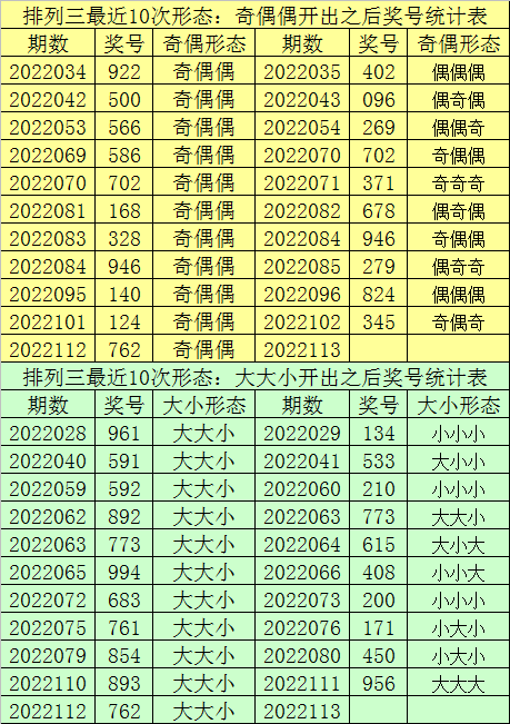 排列三最近10次同时开出奇偶形态:奇偶偶和大小形态:大大小时其奖号分别为:980-962-580-960-562-762-582-762-980-780-762,下期分别开出号码为:962-700-614-906-173-793-675-779-525-853,详细统计见下表: