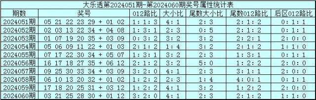 体彩大乐透第24060期奖号为:03 21 25 28 30+01 12,其中前区奖号012路比为3:2:0,大小比为4:1,奇偶比为3:2,没有同尾奖号。