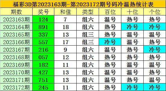 上期回顾:福彩3D第2023172期开奖奖号为:245,奖号类型为:组六,奖号冷温热态为:热号+冷号+冷号。