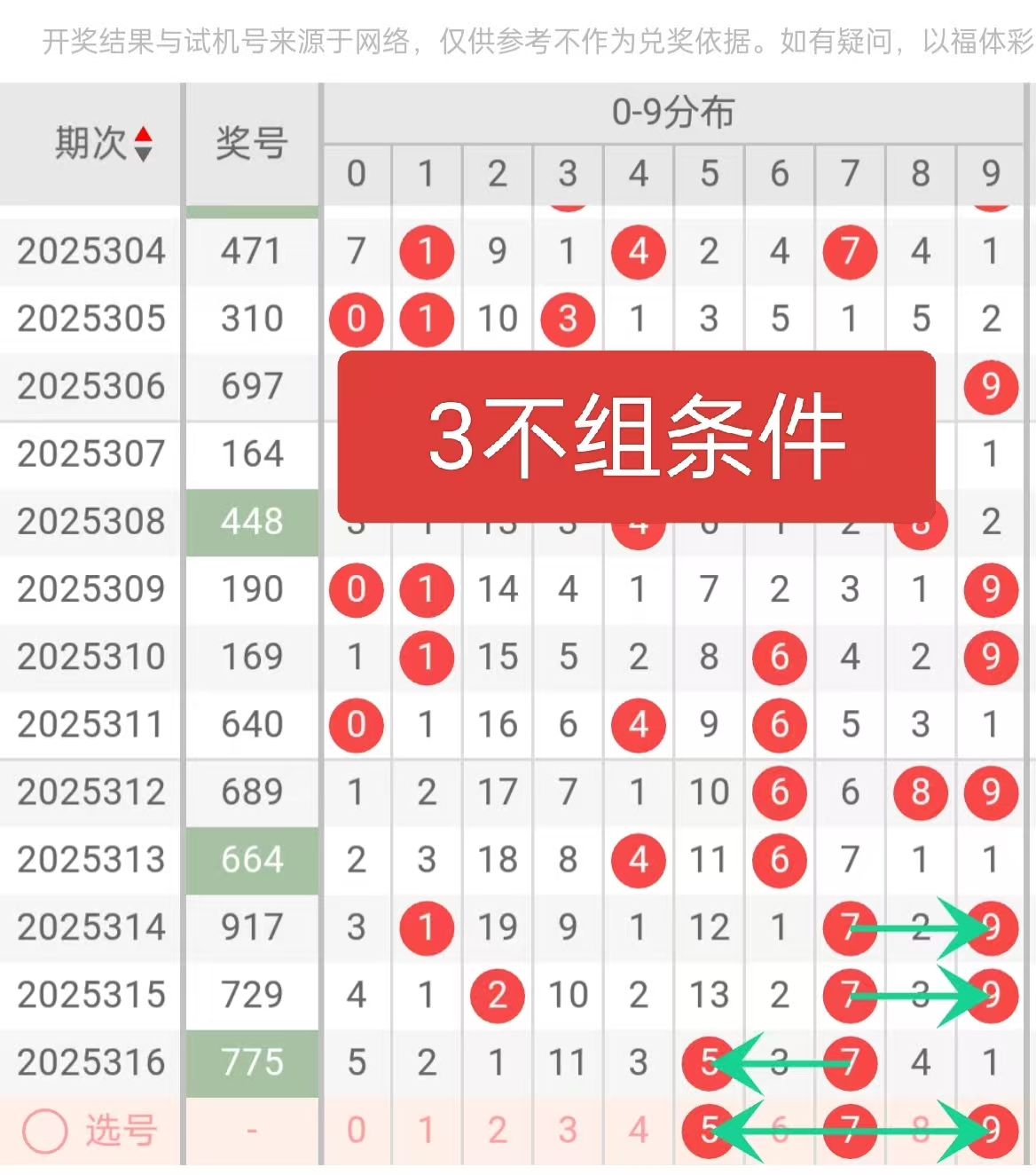 3码579不组合(即57、59、79、579不同时出现)的理由。近10期具体奖号如下:2025316期(775)、2025315期(729)、2025314期(917)、2025313期(664)、2025312期(689)、2025311期(640)、2025310期(169)、2025309期(190)、2025308期(448)、2025307期(164)。