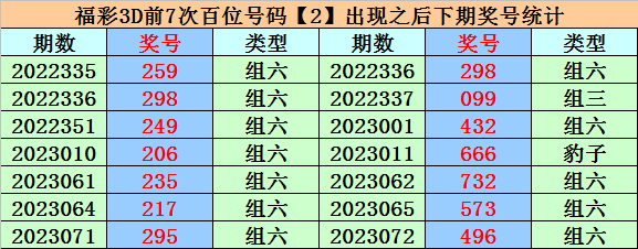 在百位号码2前7次开出之后,其下期分别开出号码:2、0、4、6、7、5、4,其中号码奇偶比为2:5,大小比为3:4,012路比为2:3:2。