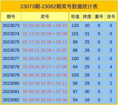 上期开奖:大乐透第23082期奖号开出:02、08、09、15、20 + 03、09。前区号码和值开出54,跨度开出18,未开出重号。后区为“0路、0路”号码。