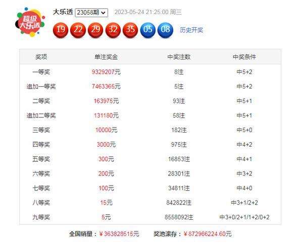 大乐透第2023058期奖号开出:19 22 29 32 35+05 08。其中前区三区比为0:2:3,和值为137,包含1个重号:19,没有开出连码,后区开出一奇一偶、一大一小奖号。