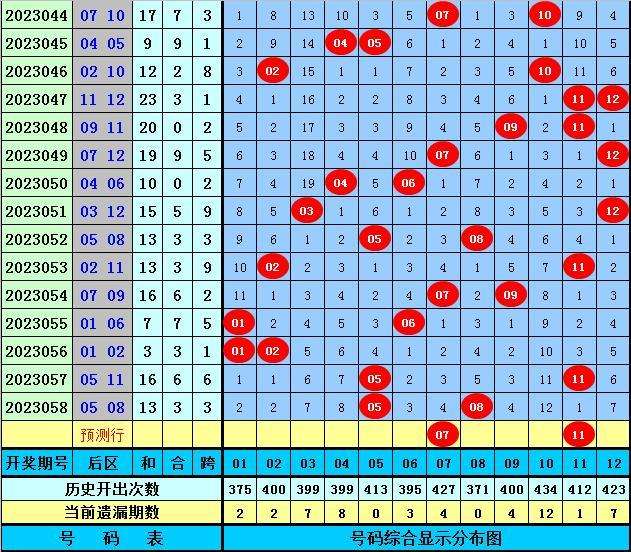 后区分析:上期后区开出一奇一偶、一大一小奖号05、08,近10期后区奖号奇偶比为11:9,奇偶号码开出个数基本相等,后区奖号大小比为9:11,大小号码开出个数基本相等,本期预计后区奖号出现在02、07、09、11、12中,参考号码07、11。