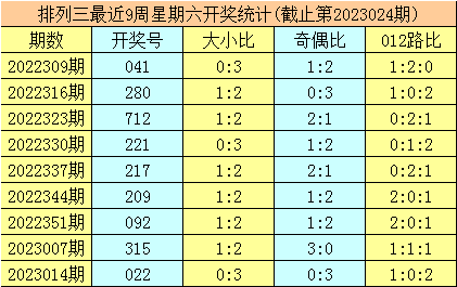 三、体彩排列三前9周星期六奖号分别开出:041-280-712-221-217-209-092-315-022,其中号码012路比为8:8:11,奇偶比为11:16,大小比为6:21;