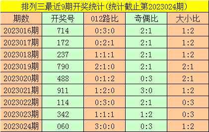 一、排列三第2023024期开出号码060,其奇偶比为0:3,大小比为1:2,号码012路比为3:0:0。该号码直选历史上出现了8次。