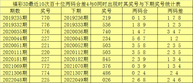 百十位合差分析:上期奖号百十位开出77组合,两码合为4,两码差为0,最近10次百十位两码合4与两码差0同时出现时,其奖号和下期奖号分别为:
