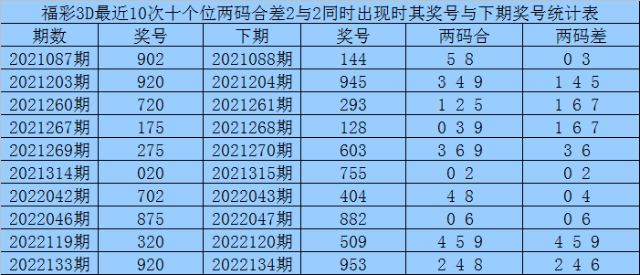 从以上统计可以看出,十个位两码合差2与2同时出现之后其下期两码合差表现最热的4个分别为:0246,本期十个位两码合差可以参考这四码中的数据。