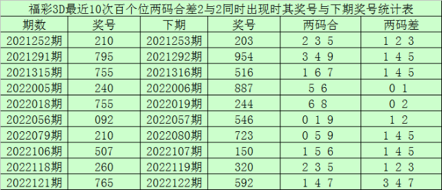 百个位合差分析:上期奖号百个位开出75组合,两码合为2,两码差为2,最近10次百个位两码合2与两码差2同时出现时,其奖号和下期奖号分别为: