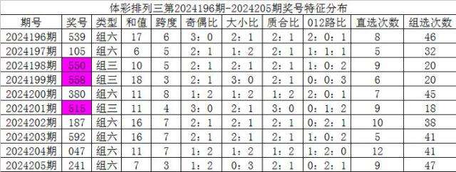 开奖公告:体彩排列三第2024205期开出奖号:241。组六,有重号:4,奇偶比1:2,大小比0:3,012比0:2:1,和值7,跨度3。