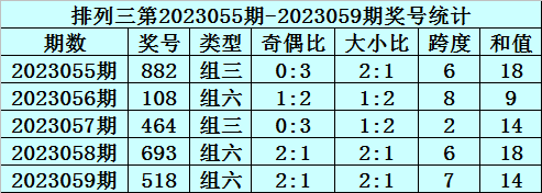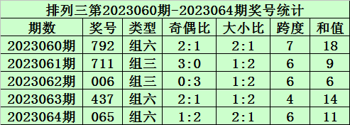 上期回顾:排列三第2023064期开奖号码为065。奖号类型为组六,奇偶比为1:2,大小比为2:1,跨度为6,和值为11。