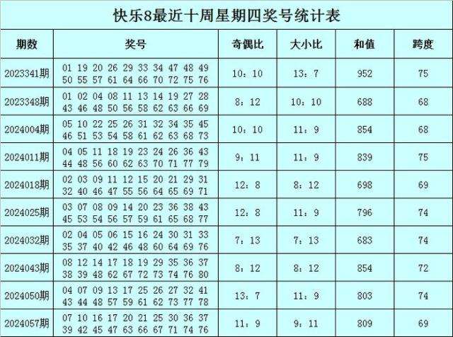 福彩快乐8第2024057期(上周四)开奖回顾:07 10 16 17 20 21 25 30 36 37 39 42 45 47 63 66 67 71 74 76,其中奖号和值为809,跨度为69,奇偶比为11:9,大小比为9:11。