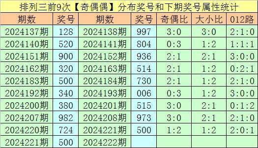上期回顾:排列三第2024221期开出奖号500,类型为:奇偶偶、200路和大小小。