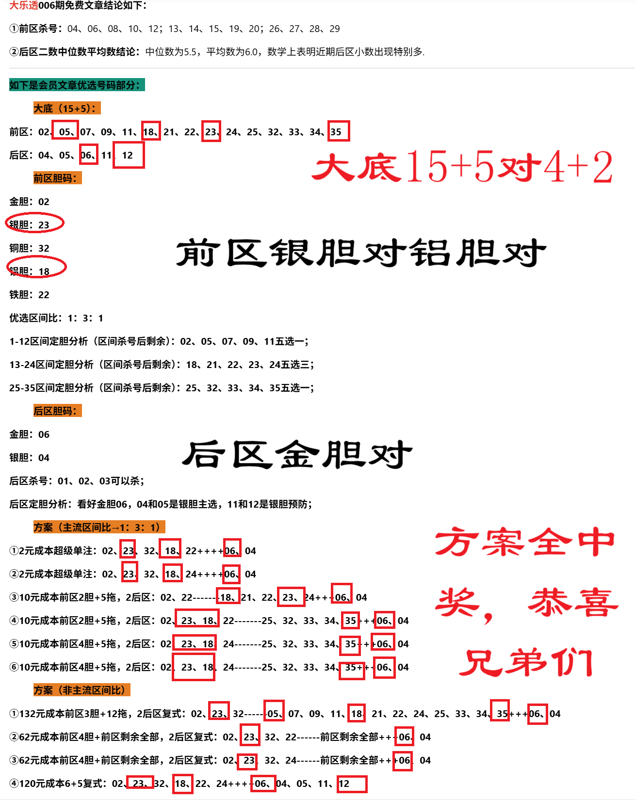 006期:方案全中奖,大底15+5对4+2,前区银胆对铝胆对,后区金胆对
