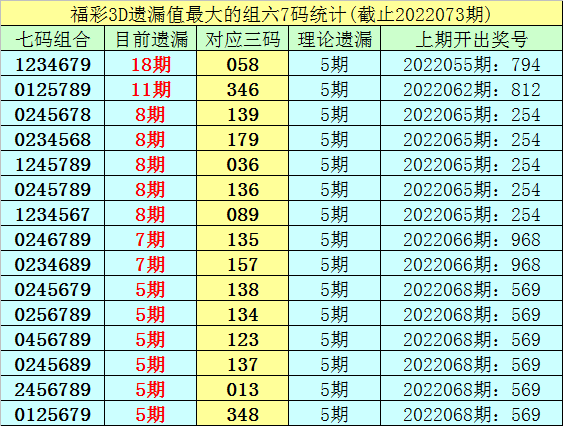 1。截止第22073期,七码组六遗漏最大的是:1234679,当前遗漏18期。