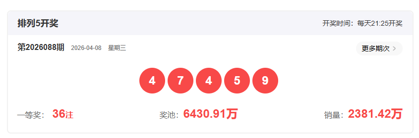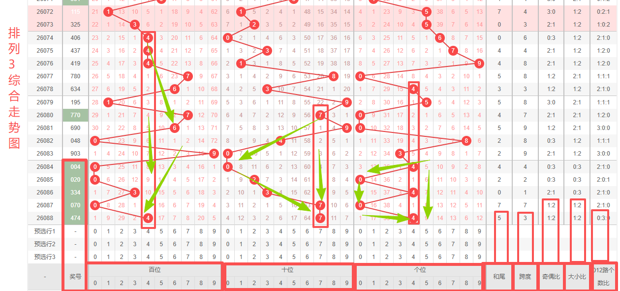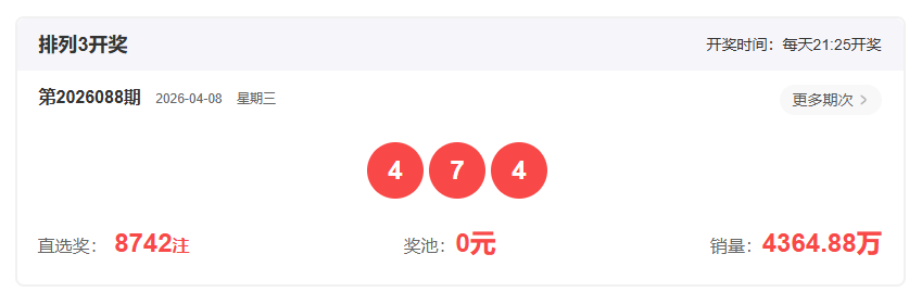 体彩排列3第2026088开奖号码474,形态为组三,奇偶比1:2,和值15,跨度3,大小比1:2,【012】路个数比0:3:0。