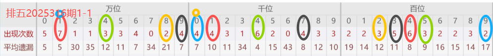 下图所圈出的为近30期各位置所出现的热码出现次数及平均遗漏值,用以参考和一些冷码组合选号。