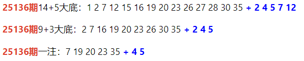 25137期14+5大底:1 2 7 12 15 16 19 20 23 26 27 28 30 35 + 2 4 5 7 12