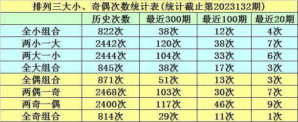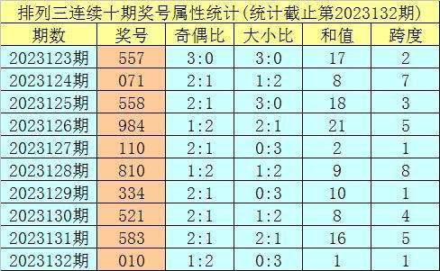 上期回顾:排列三第2023132期奖号:010。类型:组三,奇偶形态:偶奇偶,大小形态:小小小,和值:1,跨度:1。